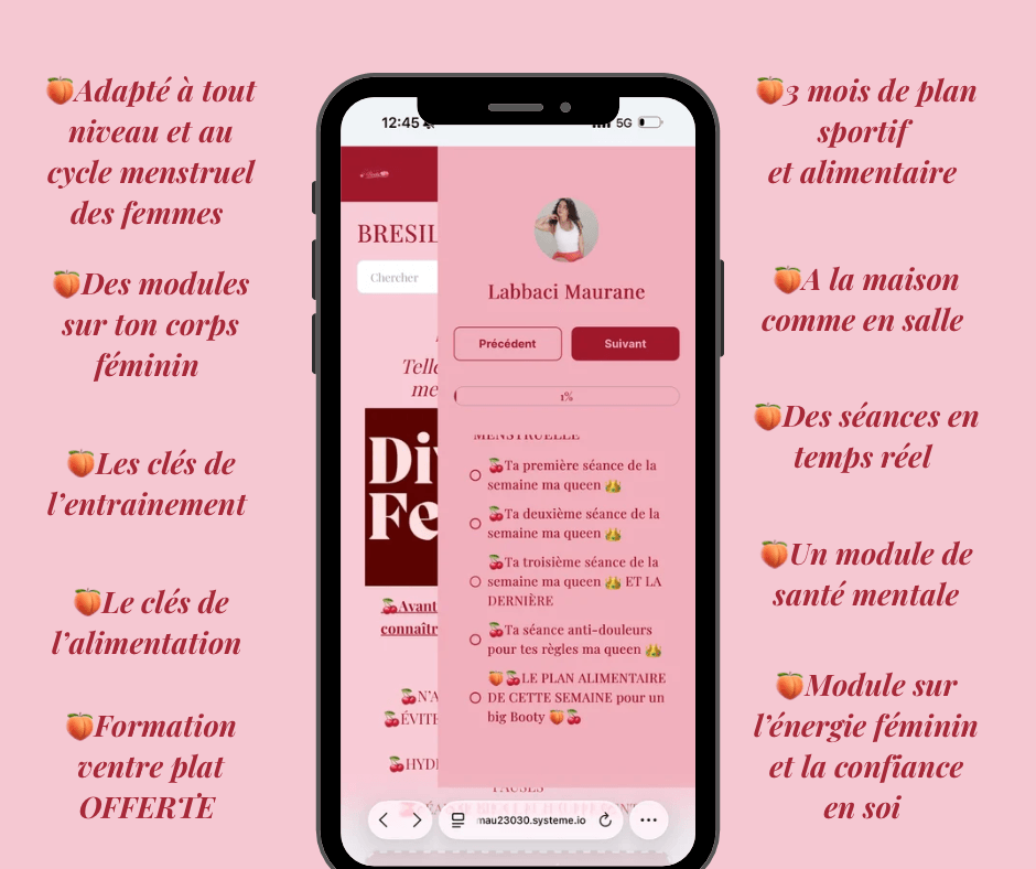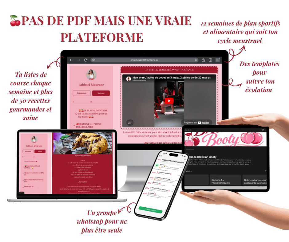 Ne stagne plus grâce au programme sportif et alimentaire évolutif, qui s'adapte à ton cycle menstruel. Ne stagne plus grâce à la méthode brésilienne qui te permet d'accentuer la difficultés semaine après semaine pour pousser ta progression à son maximum.